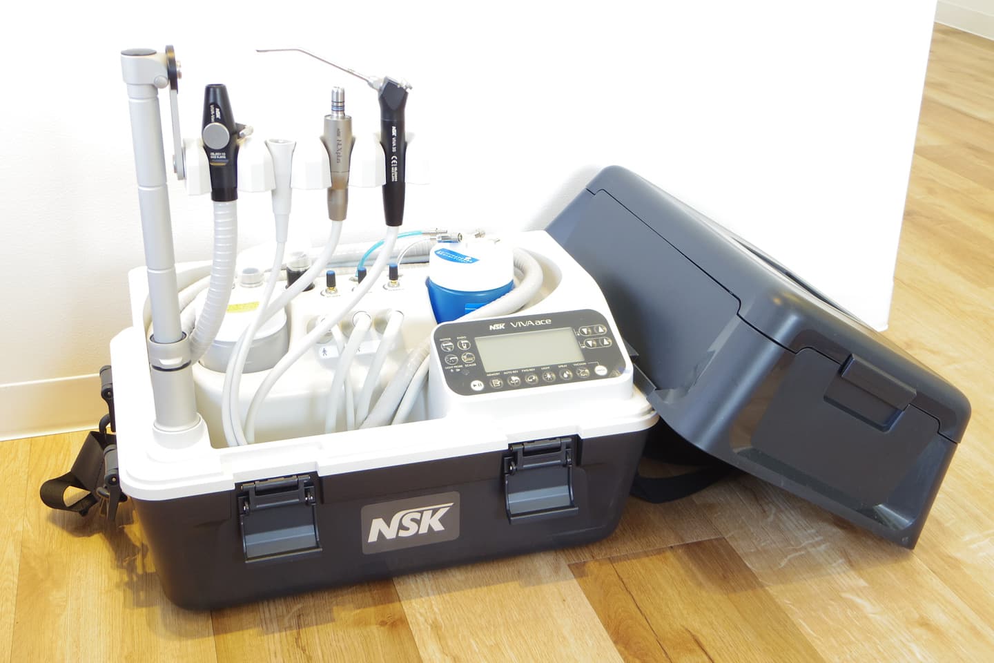 『歯医者での治療』と『訪問での治療』で大きく違うのは『設備』です。この訪問診療キットは歯医者で使用している機械を持ち運びすることができます。施設やご自宅でも質の高い治療ができるように導入致しました。