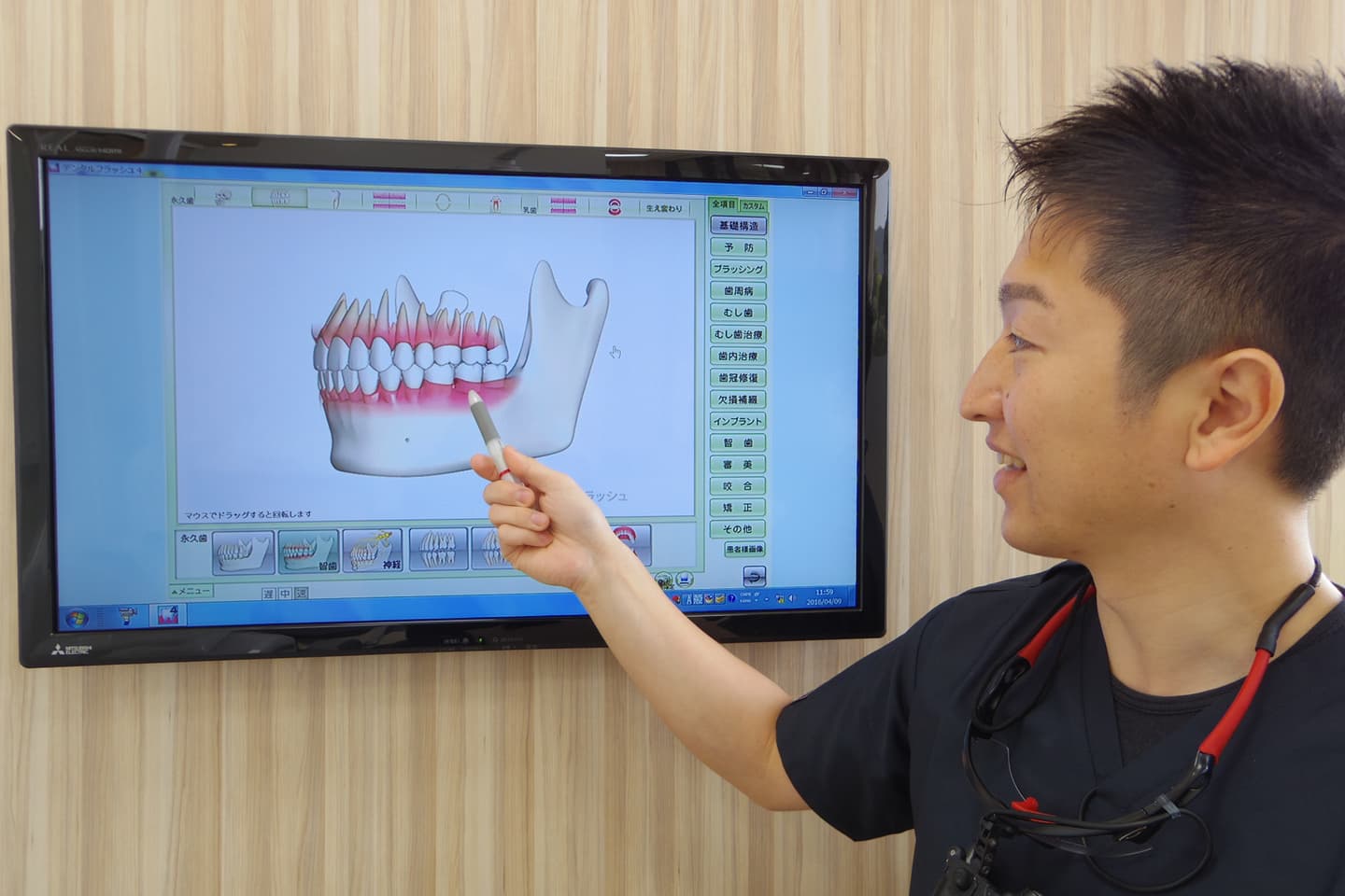 ご自身では見えにくい奥歯も、カメラで撮影することでスクリーンに映して見ることができます。しっかり目で見ていただきながら分かりやすく説明致します。写真は保存しますので、治療前と治療後で比較することもできます。